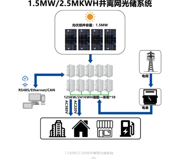 Основная конфигурация проекта включает 10 интегрированных шкафов для хранения энергии мощностью 125 кВт/241 кВт·ч, общая емкость которых составляет 2,5 МВт·ч, а общая мощность инверторов — 1,25 МВт, что обеспечивает оптимальное соотношение с фотоэлектрическими модулями мощностью 1,5 МВт. Данный интегрированный шкаф представляет собой основное оборудование для интегрированной системы солнечной энергии и накопления энергии, в котором высокоинтегрированы преобразователь PCS, система управления батареями BMS, литиевые аккумуляторные батареи, система температурного контроля, система пожаротушения и блок защиты при подключении к сети. Он обладает такими основными преимуществами, как интеграция, модульность и простота развертывания. Основные характеристики приведены ниже: